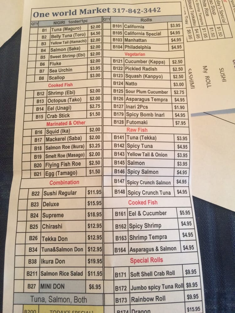 One World Market is a diverse international grocery and sushi bar located in Indianapolis. Offering takeout, delivery, and vegan options, this restaurant is perfect for those looking for a unique dining experience. The casual atmosphere with moderate noise levels is suitable for groups and families, with options for outdoor seating available. Their menu includes a variety of Japanese dishes, with waiter service and happy hour specials. The convenient location, along with amenities like free Wi-Fi, private parking, and beer and wine options, make One World Market a standout in the local dining scene. The friendly staff and delicious food will leave you satisfied and eager to return for more.